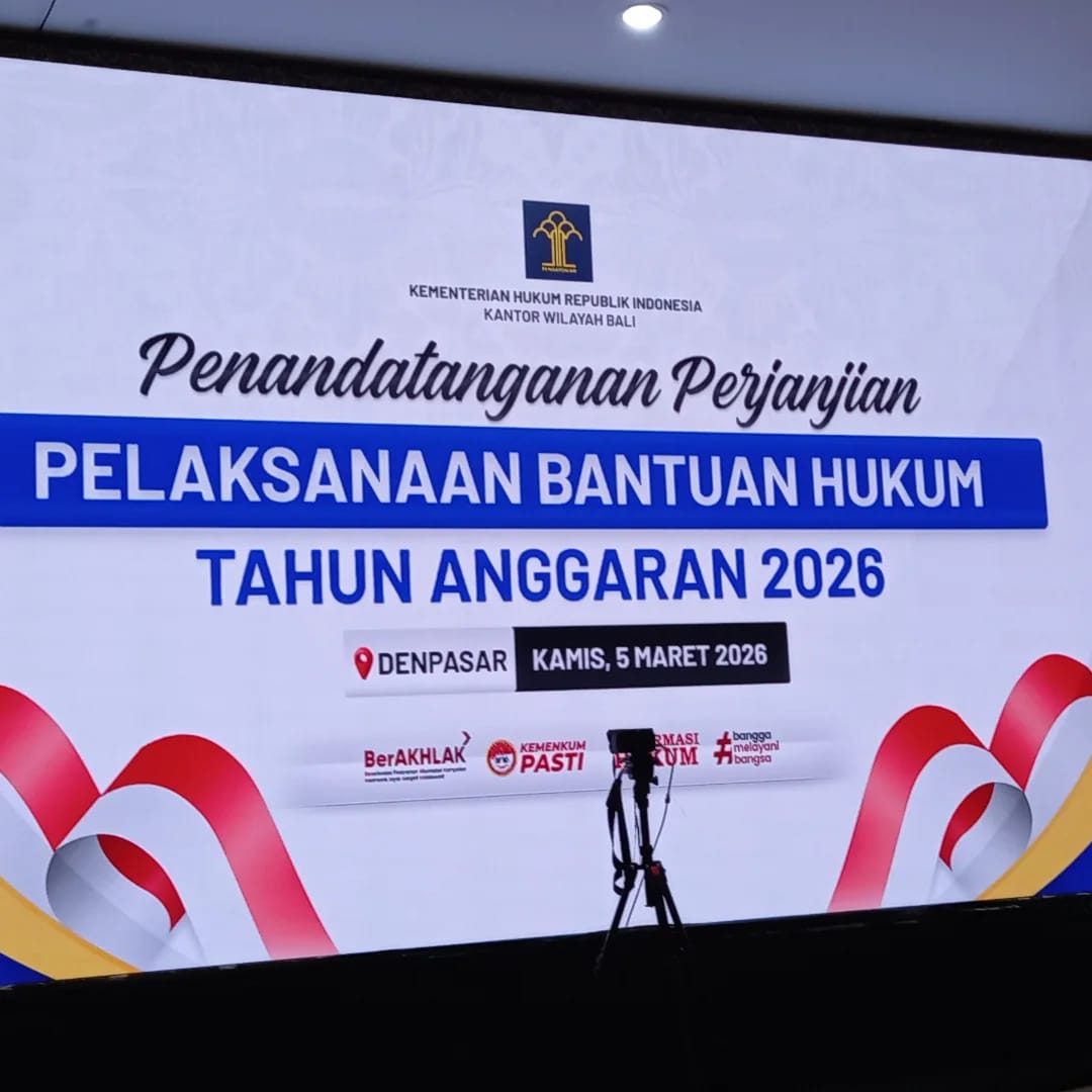 Denpasar – DPC PERADI Denpasar melalui organisasi sayapnya Pusat Bantuan Hukum (PBH) PERADI Denpasar kembali menandatangani Perjanjian Pelaksanaan Bantuan Hukum Tahun Anggaran 2026 yang diselenggarakan oleh Kantor Wilayah Kementerian Hukum Provinsi Bali, pada Kamis, 5 Maret 2026, bertempat di Ruang Dharmawangsa, Kantor Wilayah Kementerian Hukum Bali.